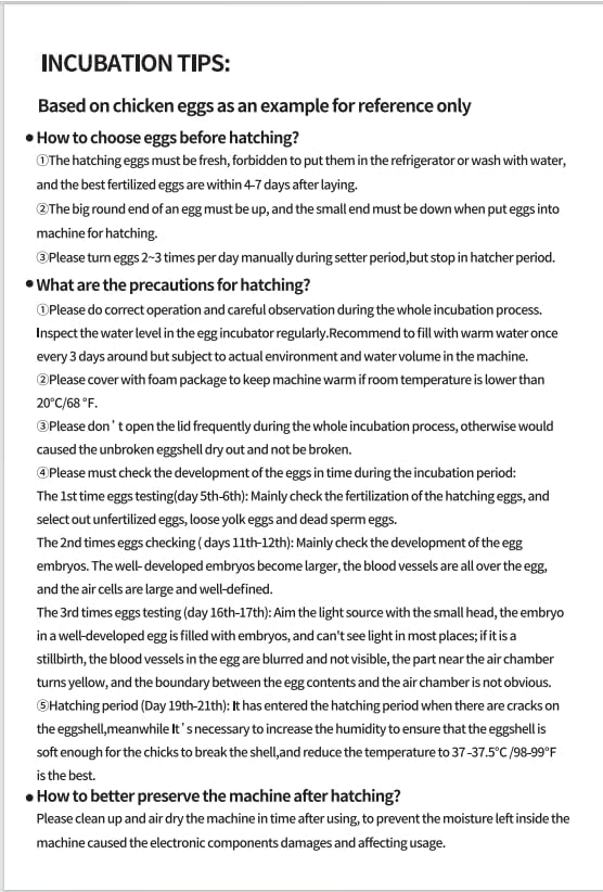 - Automatic Egg Turning-- The egg hatching incubator can automatically turn the eggs once in 2 hours (Each time lasts for 10 seconds), avoid adhesion of eggshells and egg trays, improve hatchability. Meanwhite, the function allow for hatching chicken, duck, quail, parrot, and many other types of poultry eggs. (Initial Activation: The eggs are turned once when powered on. Auto-cycle: Automatically rotate eggs every 2 hours for consistent warmth and improved hatching success.)