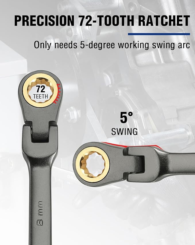 WORKPRO 8 mm Flex-Head Ratcheting Combination Wrench, Cr-V Constructed, Nickel Plating, 72-Teeth, 12 Point Design, Metric