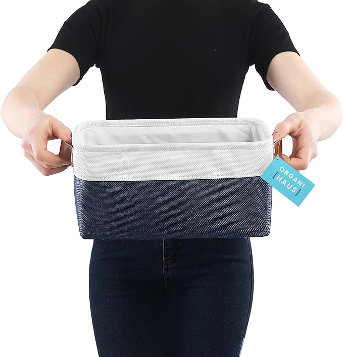 OrganiHaus Small Fabric Storage Baskets for Shelves 3 Pack, 12x08in Closet Storage Bins for Shelves, Canvas Baskets for Organizing, Linen Closet Organizers, Cloth Basket, Navy Blue/Off-White