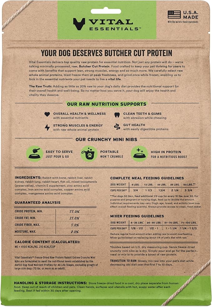 - CRUNCHY FREEZE-DRIED RAW RABBIT DOG FOOD: Vital Essentials Crunchy Freeze Dried Dog Food packs more protein than industry standard into every bite to deliver the peak vitality your dog deserves, especially when compared to dehydrated dog food. This complete and balanced freeze-dried raw dog food is made with premium butcher cut rabbit, responsibly sourced in the EU.