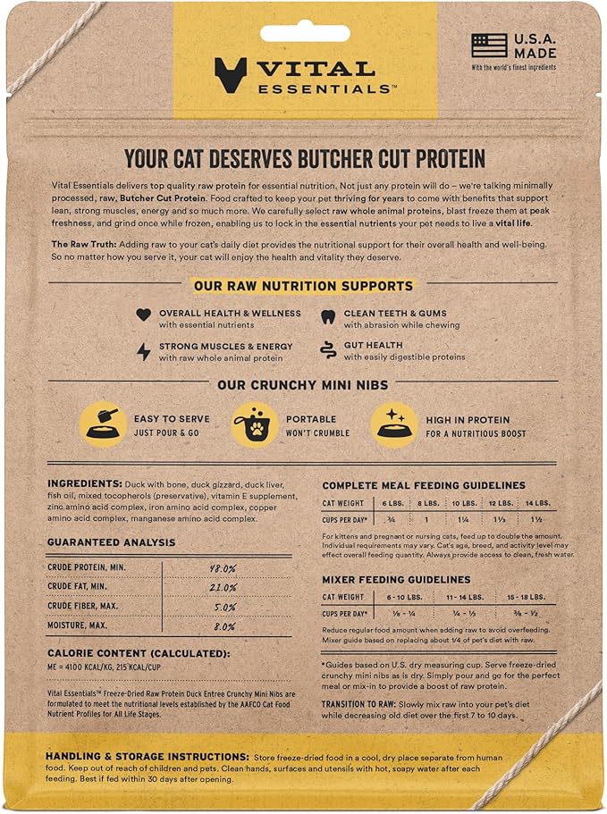 - CRUNCHY FREEZE-DRIED RAW DUCK CAT FOOD: Vital Essentials Crunchy Freeze Dried Cat Food packs more protein than industry standard into every bite to deliver the peak vitality your cat deserves, especially when compared to dehydrated cat food. This complete and balanced freeze-dried raw cat food is made with premium butcher cut duck, responsibly sourced in the EU.