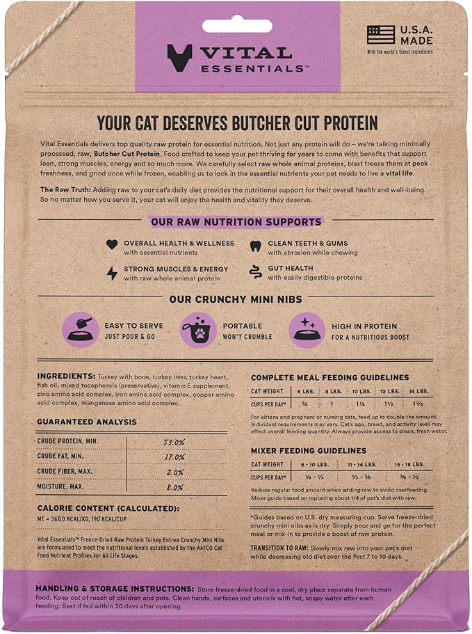 - CRUNCHY FREEZE-DRIED RAW TURKEY CAT FOOD: Vital Essentials Crunchy Freeze Dried Cat Food packs more protein than industry standard into every bite to deliver the peak vitality your cat deserves, especially when compared to dehydrated cat food. This complete and balanced freeze-dried raw cat food is made with premium butcher cut turkey, responsibly sourced in the USA.