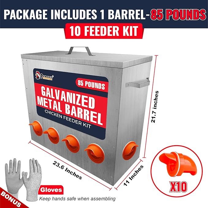 - [ Packing Information ] Our product is always produced with the high quality and checked carefully before packaging in the box. Packaging Includes: 1 x 85 pounds metal barrel, 10 x feeder ports & 1 x gloves. Easy to install with full accessories and accompanying instructions