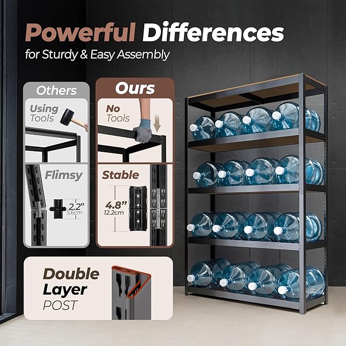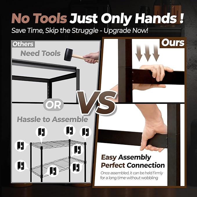 - EASY BOLTLESS ASSEMBLY (MALLET INCLUDED) – No bolts or nuts required. Simply slide and lock parts together using the included Rubber Mallet. Shelves are height-adjustable in 1.18-inch increments.