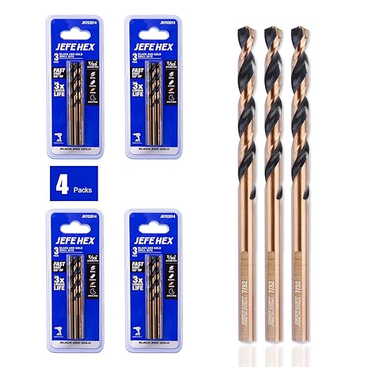JEFE HEX 12 Pcs 7/32" (Pack of 3, 4 Pack, Total 12) HSS Jobber Twist Drill Bit Set 3 Flats Shank Black and Gold Drill Bits