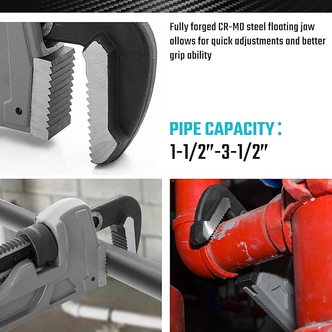 - Plumbing wrench has a non-stick knurled adjustment nut, and self-cleaning threads with easily replaceable hook jaw, heel jaw, and spring assembly. 36 inch pipe wrench overbite jaws provide maximum gripping surface