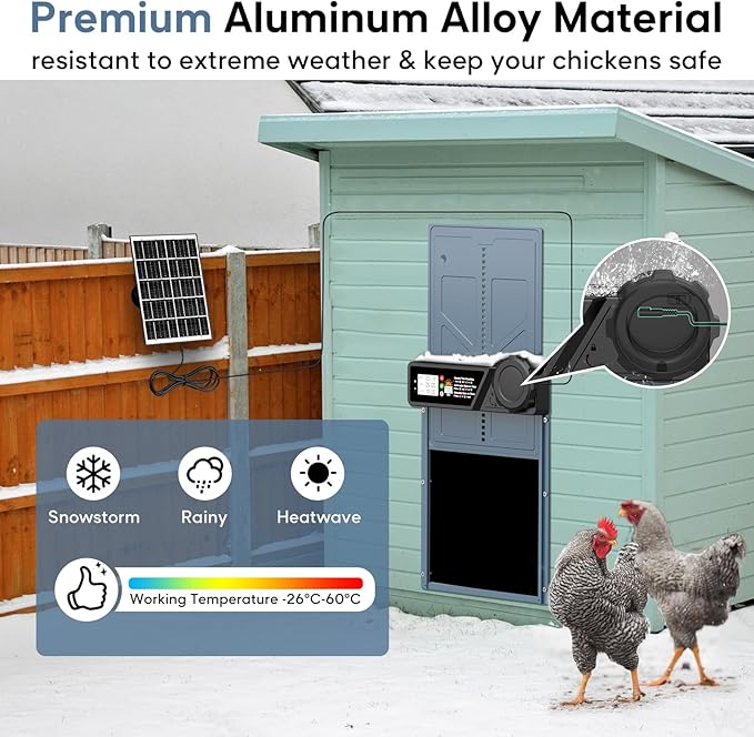- 🏅 [Durable Aluminum Alloy Construction] Made from high-quality aluminum alloy and ABS materials, this automatic chicken door is weatherproof and built to last, withstanding temperatures from -26°C to 60°C. Keep your chickens safe in any weather conditions.