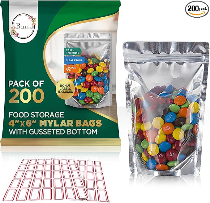 BELLE KR® 4x6 Mylar Bags for Food Storage with 7.5mil Thick - Pack Of 200 - Stand Up Clear Mylar Bags with See Through Window - Small 1/2 Pint Pouches for Freeze Dried Candy - Labels Included