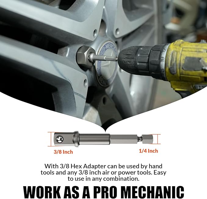 - MECHANIC TOOL - Each bolt remover with a standard 3/8-inch drive, uses the 1/4"-3/8" hex adapters that can connect with a common impact wrench, tap handle, and ratchet wrench. Easily remove lug nut, oil drain plug, broken and seized bolts. Perfect for every home and mechanic, home repairs, auto repairs, and mechanical repairs. A great addition to toolset, worth every penny spent.