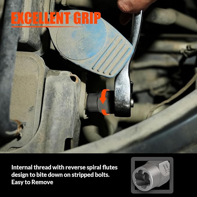 - EXCELLENT GRIP - The special internal thread design of bolt extractor interior is precision engineered, and the reverse helical grooves are designed to snap in for maximum holding force, providing excellent torque, easy to use and remove peeled, rusted or frozen, damaged bolts, nuts and screws in car repair and industrial instrumentation.