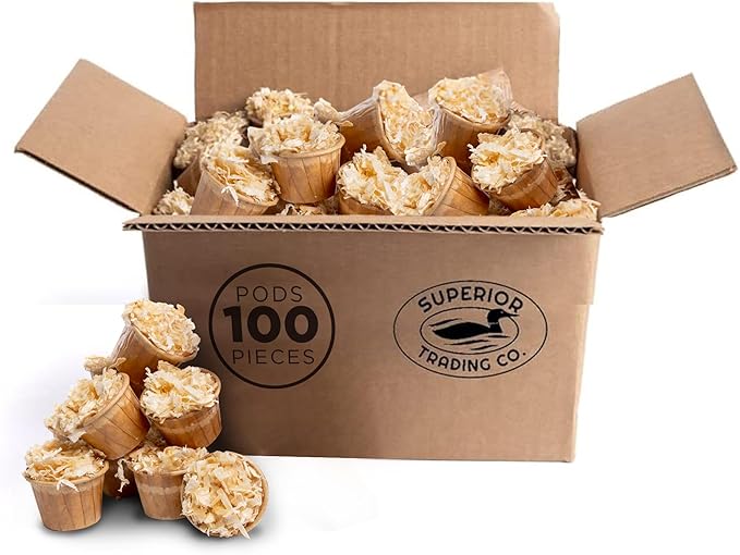 - EFFICIENT KINDLING: Superior Trading Co.'s fire starter pods are created using natural wood shavings and food-grade wax, and each pod measures 1.5" x 1.75". These fire starters eliminate the requirement for lighter fluid, charcoal lighter, or any other kindling tool to start a fire. Simply light the pod with a match, and it will burn for 15-20 minutes with ease.