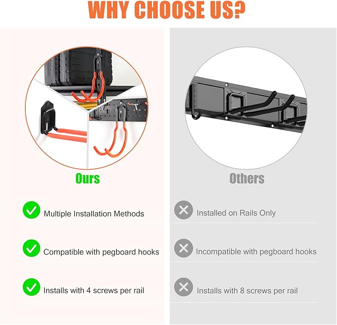- UPGRADED—This new garage storage system maximizes practicality. The rails feature pegboard holes to fully utilize space with compatible hooks. Large hooks come with screws for multiple mounting options like walls or keyhole shelves.