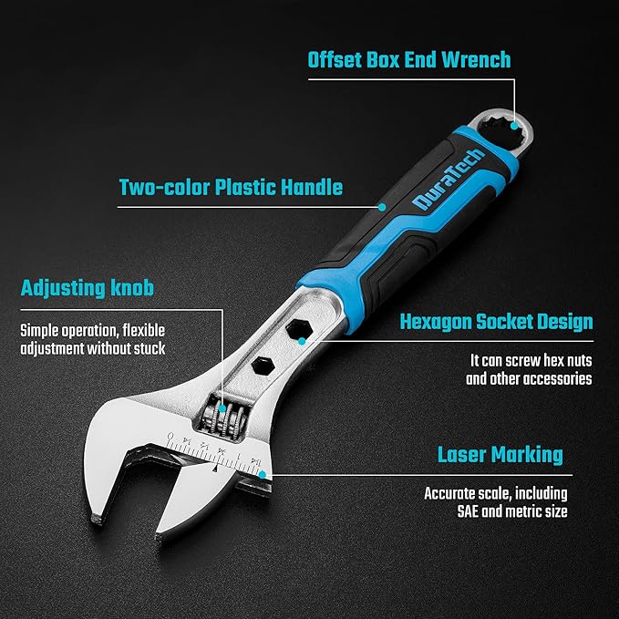 DURATECH 10 Inch Adjustable Wrench, 3-in-1 Spanner with Box End/Hex Function, CR-V Steel, Metric & SAE Scales, Chrome-plated, Bi-material soft Grip