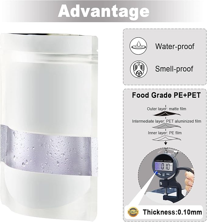 - 【High Quality】120pcs white mylar bags.The material of stand up storage bags is mylar film and aluminum film.The thickness of 0.10mm.Because of the photography and the monitor reason, cannot accept the chromatic aberration the buyer please discretely to purchase, thank the cooperation.