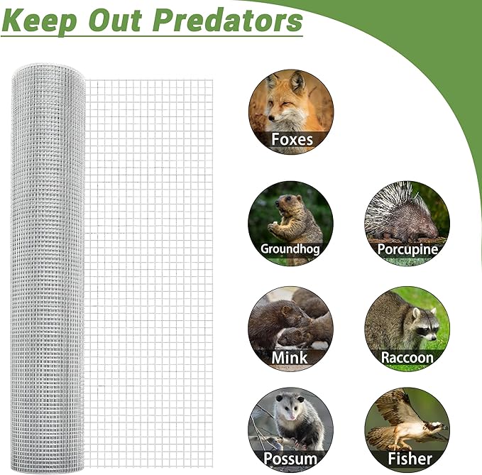 - Square mesh: The 1/2-inch mesh opening with flexible welding wire can be used to build wire walls and roofs for chickens, ensuring their safety and preventing hawks, foxes, and raccoons. The 1/2" x 1/2" square opening is still small enough to cover squirrels.