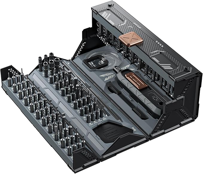 - 【APPROPRIATE SCREWDRIVER SET】 This compact screwdriver repair tool kit features a stackable design and shaped like a container, allowing multiple sets to be stacked. 160 common magnetic bits are built into the 4 partitions for easy access and won't fall out. Each bit is marked with standard or inch markings for quick identification of the screwdriver bit you need. Also included are straight and curved ESD tweezers, opening picks, crowbar, suction cup for easy screen removal and carrying.