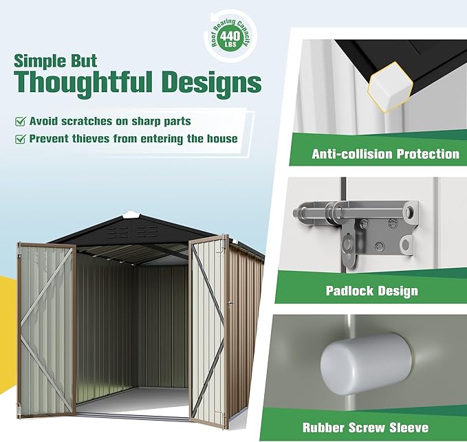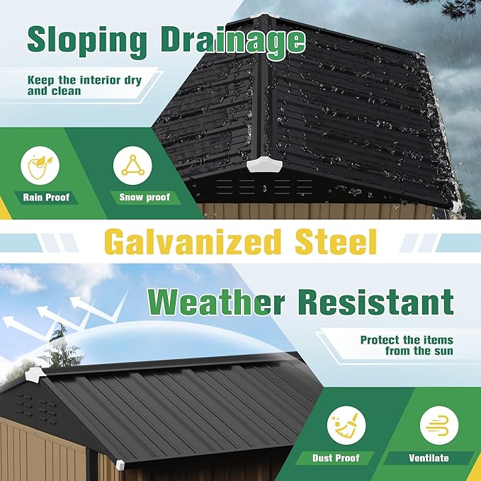 - [Weather Resistant Material] This outdoor storage shed is made of galvanized steel and the special coating layer makes the garden shed not easy to rust and corrosion. Designed for long time outdoor using, make sure the stability of your items.