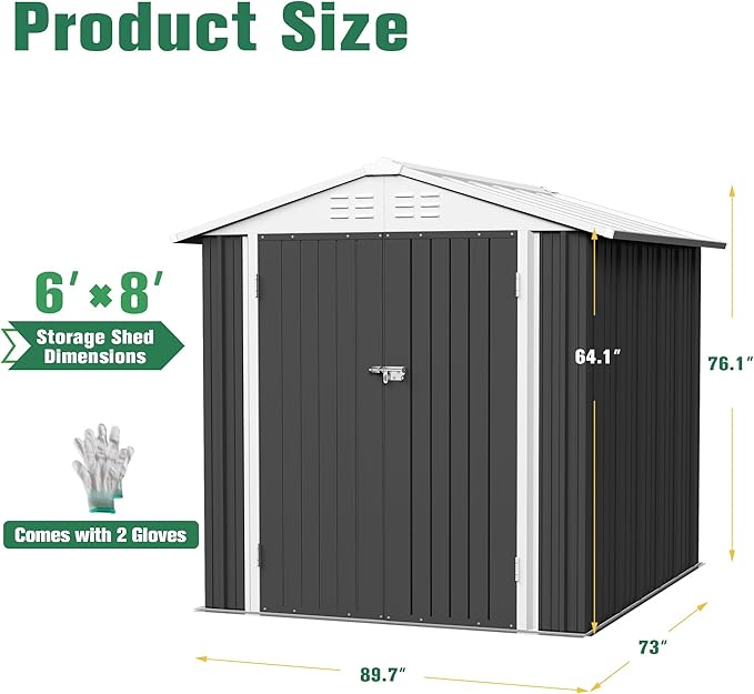 - [Weather Resistant Material] This outdoor storage shed is made of galvanized steel and the special coating layer makes the garden shed not easy to rust and corrosion. Designed for long time outdoor using, make sure the stability of your items.