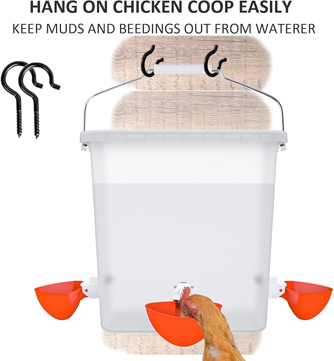 - Efficent chicken feeder and waterer kit includes 2.6 gallons water barrel, 16lbs feeder bucket, 3 chicken cups and 3 chicken feed ports and hooks accessories; easy to hang on wire chicken fence or chicken coop wall