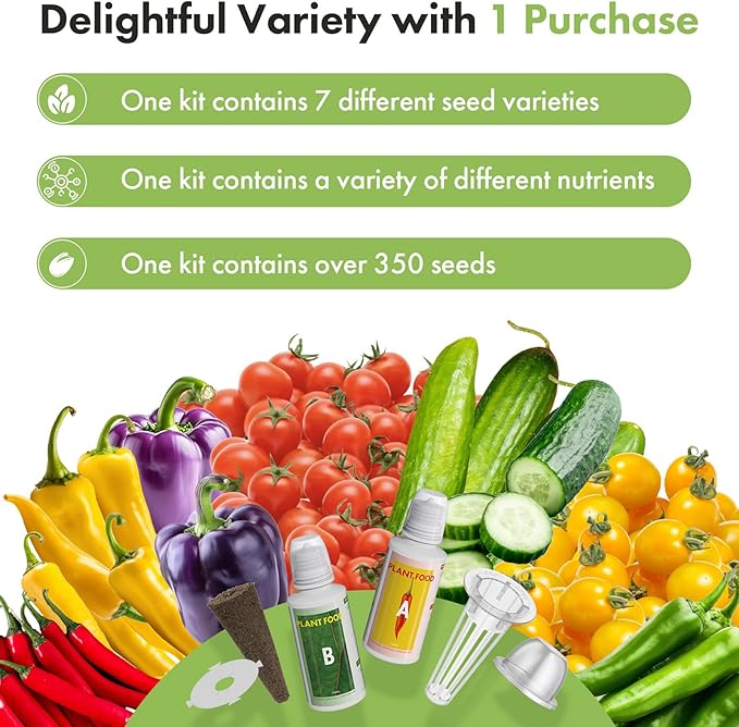 - 【 7 Kinds of Vegetable Seeds】Hydroponic fruit seed kit not only has 7 kinds of seeds (Golden Red Cherry Tomato Purple Bell, Green, Yellow Pepper) but also includes a set of 7 growth sponges, 7 pod labels, 7 baskets, 7 domes, and A&B Plant Food. With more than 350+ seeds, choose your favorite hydroponic seeds to plant and enjoy endless planting fun