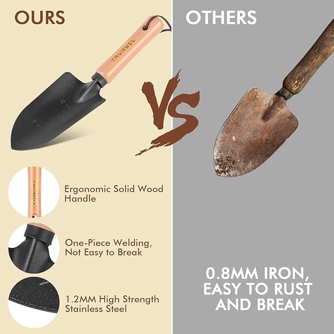 - Durable Stainless Steel - Heavy-duty stainless steel heads can withstand the toughest roots, rocks, and soil, sturdier than cast aluminum/coated/carbon steel, No need to worry about rusting and breaking during pruning, digging, weeding, etc. Mirror-polished process to make the tool get the minimal soil adhesion and easier cleaning.