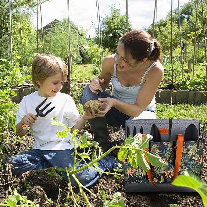 - Cover All You Need - 10 pieces garden tool kit has a handy tote bag, pruning shear, garden trowel, transplanter, weeder, hand fork, hand rake, kneeling pad, sprayer, garden gloves. All the gardening supplies are made of safe, non-toxic and harmless materials.