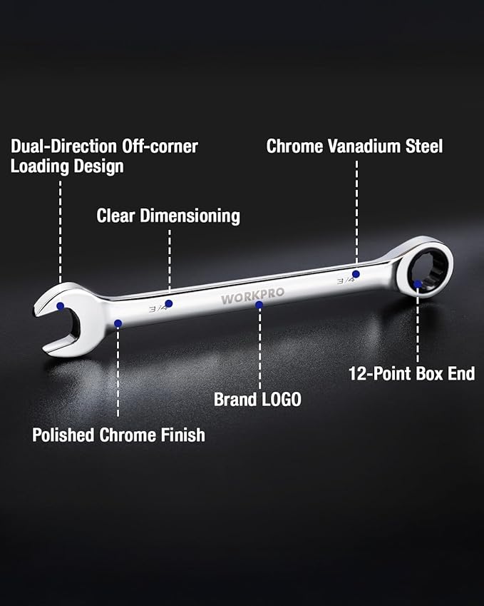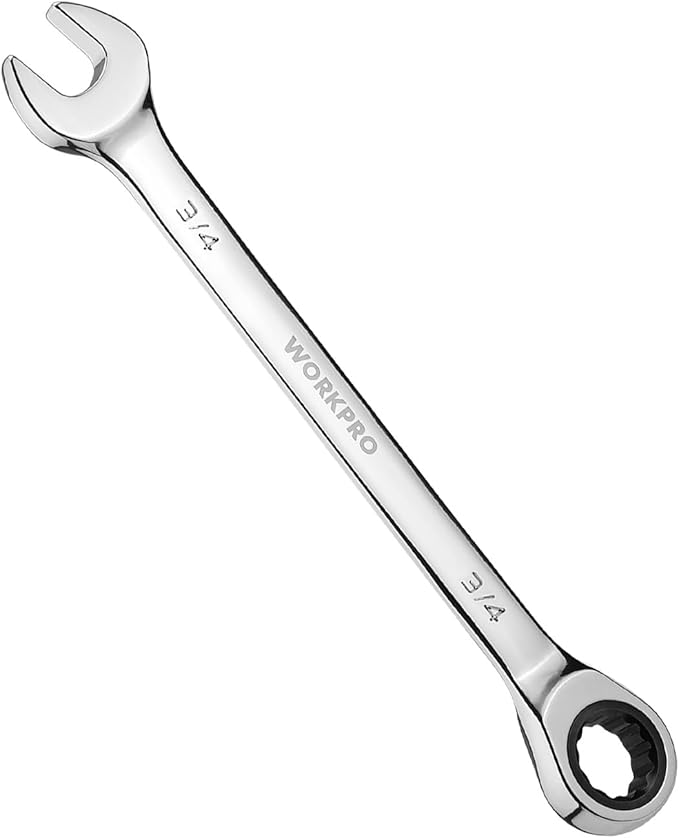 WORKPRO 3/4" Ratcheting Combination Wrench SAE, CR-V Constructed with Mirror Polish Chrome Plating, 12-Point Design, 15-Degree Offset