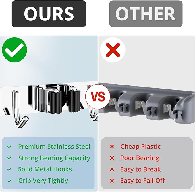 - 🏡【STURDY BROOM HOLDER】Each broom holder wall mount has 4 racks and 5 hooks. Our broom holder is made of sturdy 304 stainless steel which means it is corrosion-resistant, rustproof and waterproof. Compared with the plastic broom rack, our broom organizer is more stronger and has a longer service life.