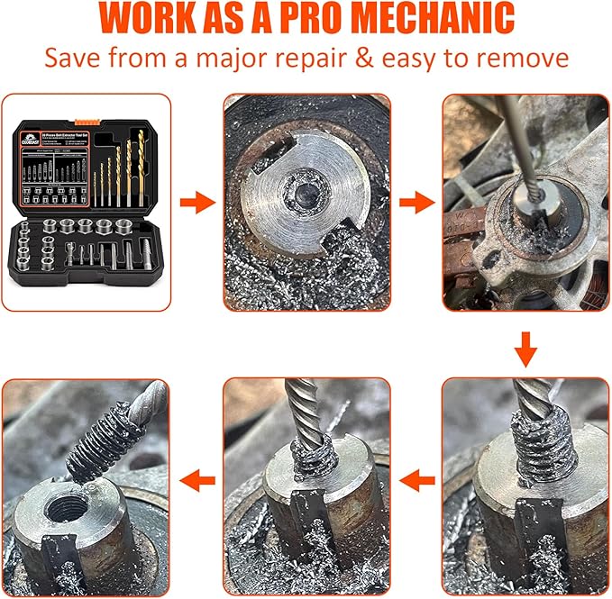 - EXTRACT BROKEN SCREW - 6Pc spiral screw extractors with spiral flutes embed themselves to increase grip as resistance increases, easily spin embedded broken bolts and damaged screws out based on drill hole, help out of tough spots. Also providing extra needs can reach deeper places for bolts and screws removed. Each is made of premium Chromium-molybdenum steel material is sturdy.