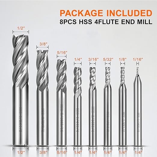 - 1/8"-1/2"Inch End Mill Set: This end mill set includes 8 diameter sizes of 1/16",1/8",5/32",3/16",1/4",5/16", 3/8",1/2", can satisfy all your different needs.