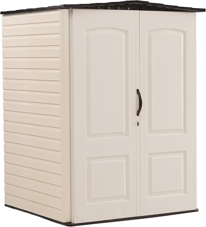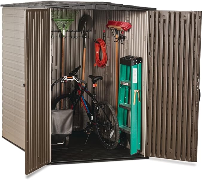 Rubbermaid Large Vertical Resin Outdoor Storage Shed With Floor (5 x 6 Ft), Weather Resistant, Brown, Organization for Home/Backyard/Garden Tools/Lawn Mower/Bike Storage/Pool Supplies