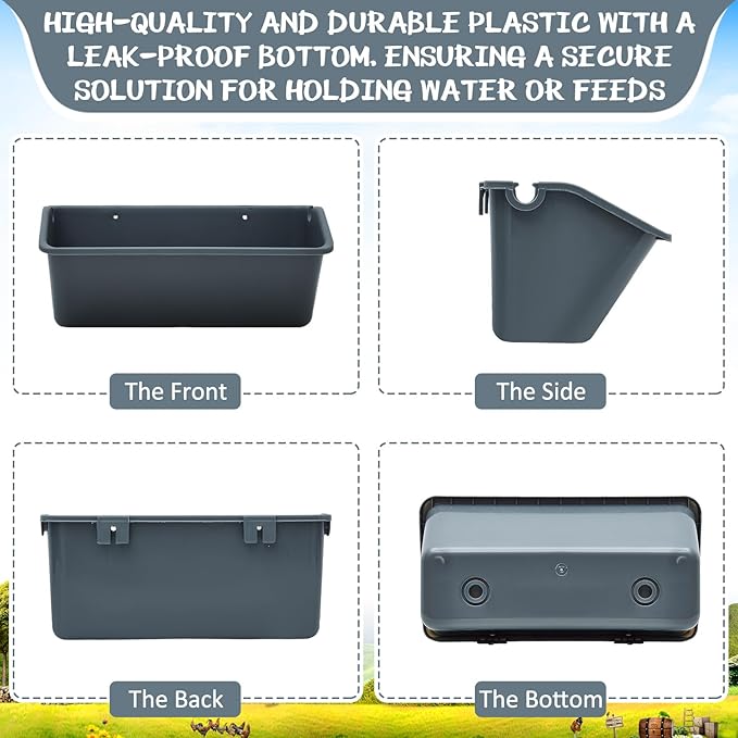 - Chicken Feeders Set: the chicken feeder is a set of deep grey feed troughs with a substantial capacity of approximately 5 quarts each; The practical goat feeders are designed with a solid base, having no holes, to ensure secure installation, the kit provides metal D shaped metal clips and expansion screws; Various quantities available for you to choose from, it's a versatile choice for chickens, ducks, geese, goats, pigs, horses, and dogs