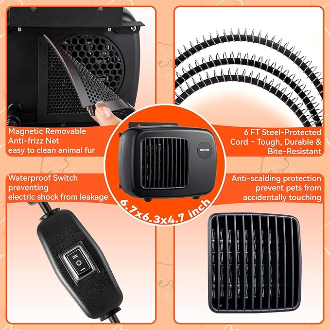 - 【🔥🐶 Pet Friendly Heaters】The pet electric heater features an insulated surface so you don’t have to worry about burning your dog. With a maximum power of 600W, it heats up in just 3 seconds to deliver consistent warmth, quickly eliminating the chill. Equipped with temperature limiting, overheat protection, and a 6FT steel wrapped anti bite cord, it ensures safety and durability for long term use