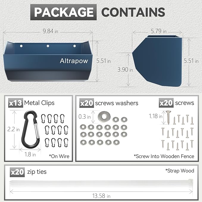 - EASY TO INSTALL AND CLEAN: We will provide three hanging methods of clips, nylon ties and screws for you to install the feed troughs. The feed trough can be hung on the wire fence or mounted on the wall or wood fence. And you only need to use a brush and water to clean the fence feed trough.