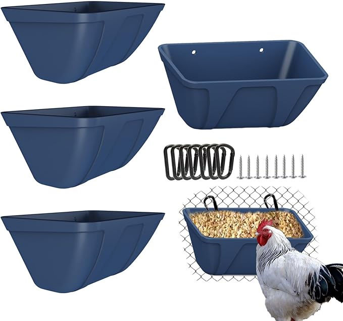 - The poultry feeder with sturdy structural design against warpage and easy to be mounted on walls, wire chicken fences with clips or screws; 4 PACK chicken feed trough and each come with 2 clips and screws