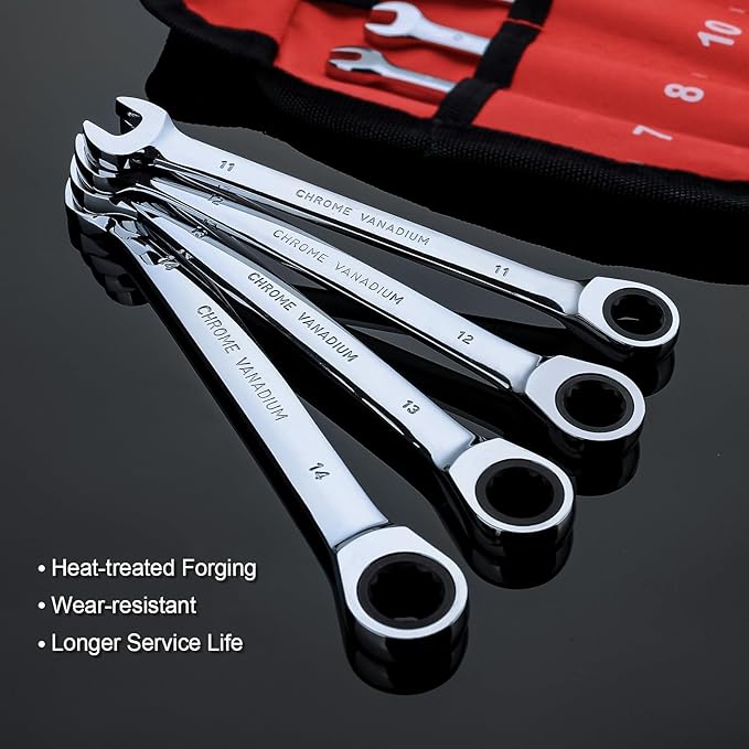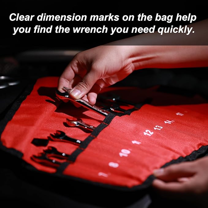 - Convenient Storage: This ratchet wrench set comes with Oxford roll bag for easy storage and carrying. Each independent storage bag has corresponding size recognition. 2 hanging rope for easy hanging. The cover of bag can prevent the wrench from slipping out. They roll up neatly in bag for carrying to anywhere in your car trunk or mechanics gear.