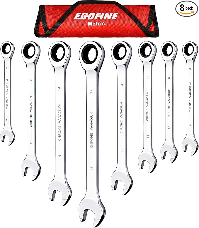 Egofine 8-Piece Ratcheting Wrench Set, Cr-V Steel Mertic Wrench Set from 7mm to 17mm wrench, 72 Teeth Ratchet Wrench, 12 Point Open End & Box End Combination wrench set with Roll Up Pouch