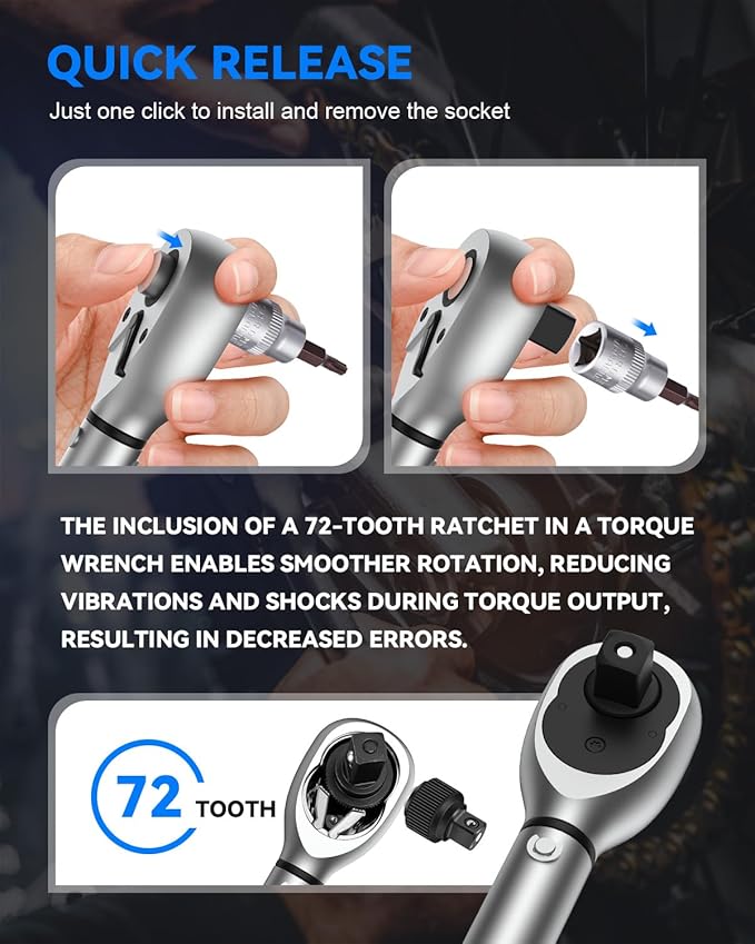 - Durable Material and Compliance with Standards: Crafted from robust Chrome Vanadium Steel for strength and longevity, this torque wrench set meets international standards ISO6789-2003, GB/T15729-2008, and ASME B107.14M, ensuring both quality and reliability in frequent use.