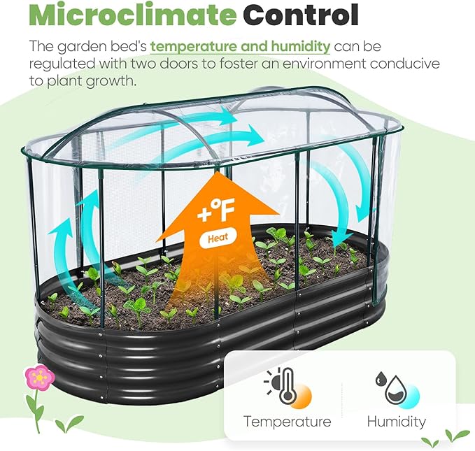 - 【Extending the Growing Season】Raised garden bed with cover ensures your plants thrive even during the winter and spring.It comes with a PVC cover that allows for excellent light penetration, facilitating photosynthesis in plants, making it an excellent companion for your spring seedlings. The height of the raised planter box with the frame added reaches 36.6 inches. The frame's arched top design allows for greater internal space, giving your tomatoes and peppers plenty of room to grow.