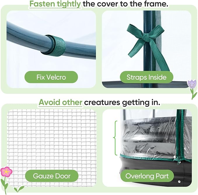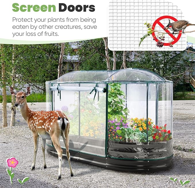 - 【Dual Zippered Screen Doors】The two doors not only make your daily plant care routine more convenient but also facilitate the flexible regulation of temperature and humidity inside. The screen ensures air circulation while also protecting plants from small animals. No more worrying about birds pecking at your broccoli and strawberries!