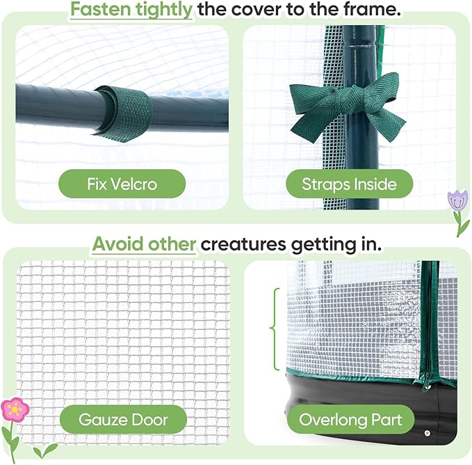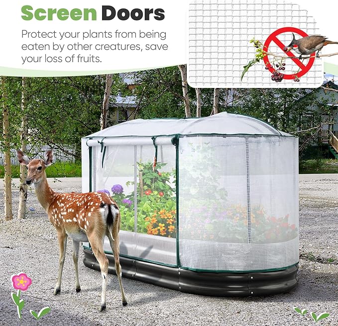 - 【Dual Zippered Screen Doors】The two doors not only make your daily plant care routine more convenient but also facilitate the flexible regulation of temperature and humidity inside. The screen ensures air circulation while also protecting plants from small animals. No more worrying about birds pecking at your broccoli and strawberries!