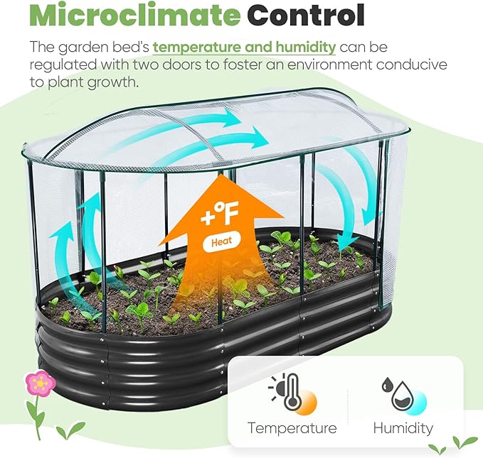 - 【Extending the Growing Season】Raised garden bed with cover ensures your plants thrive even during the winter and spring. It comes with a PE cover that effectively maintains temperature within the greenhouse, making it an excellent companion for your spring seedlings. The height of the raised planter box with the frame added reaches 36.6 inches. The frame's arched top design allows for greater internal space, giving your tomatoes and peppers plenty of room to grow.