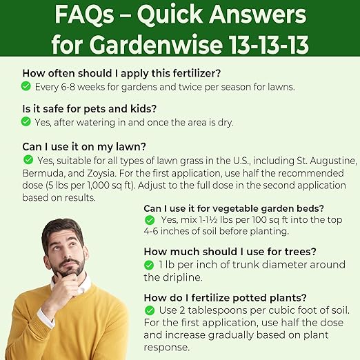 - 🌿 Balanced 13-13-13 Fertilizer for Outdoor Plants: Provides 13% Nitrogen, 13% Phosphorus, and 13% Potassium for optimal growth. Perfect for lawns, vegetable gardens, rose bushes, flowers, shrubs, and trees. Ideal for St. Augustine grass, evergreens, and all outdoor plants.