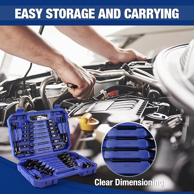- 22 Sizes in Metric and SAE: This ratcheting wrench set includes a full range of sizes: 6mm, 8mm, 9mm, 10mm, 12mm, 13mm, 14mm, 15mm, 16mm, 17mm, 18mm, 1/4", 9/32", 5/16", 11/32", 3/8", 7/16", 1/2", 9/16", 5/8", 11/16", and 3/4". These ratchet wrenches come with a sturdy toolbox for easy storage and transportation, ensuring that you have the right size wrench readily available for any task