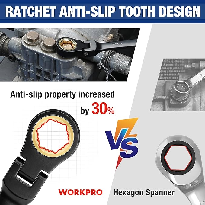 - Anti-Slip Tooth Design: Designed with the extra anti-slip tooth, these ratchet wrenches provide a secure grip, preventing slippage and ensuring safe, efficient operation. This feature enhances your control and precision during use, offering 30% better anti-slip performance compared to hexagon spanners