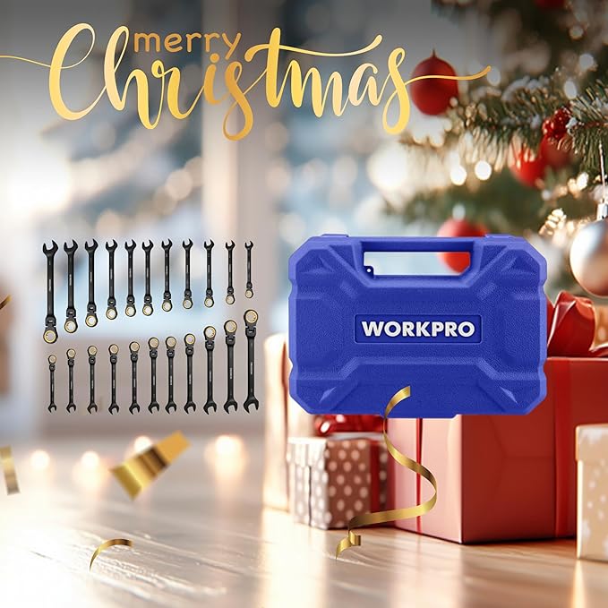 WORKPRO 22-piece Ratcheting Wrench Set with 180° Flex Head, Anti-Slip Tooth, Combination Wrench Sets with Organizer Box, Metric 6-18mm & SAE 1/4-3/4", Black Electrophoretic Coating