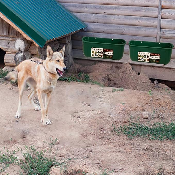 - [Versatility Usage]: Suitable for feeding livestock such as chickens, turkeys, ducks, geese, some larger birds, and small to medium-size animals like squirrels, lambs, kids, piglets, foals, fawns, calfs and small-medium dogs. The hanging feed trough is suitable for corn, grain, paddy, minerals, baking soda and water feeding