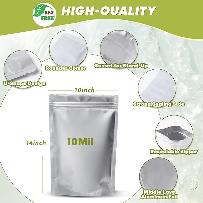 - Thicker Thickness: Mylar bags constructed with thick 10 mil layers of PET & mylar foil - each side has a maximum thickness of 5 mil, including an extra Internal layer of aluminum foil for superior puncture resistance and light/air permeation prevention