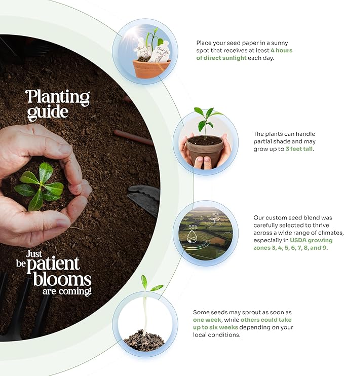 - Product Care Instructions : Insert the plantable seed paper into a sealed plastic bag, ensuring the paper is thoroughly soaked and leaving a bit of air inside to create a small bubble-like greenhouse. Maintain the temperature between 68 to 90 degrees Fahrenheit. The seed paper requires at least 4 hours of sunlight each day. Roots should begin to appear within 10 days. After spotting the roots, move the seed paper to a pot, lightly cover it with soil, and keep the seedlings moist with regular watering. Insert the plantable seed paper into a sealed plastic bag, ensuring the paper is thoroughly soaked and leaving a bit of air inside to create a small bubble-like greenhouse. Maintai… See more