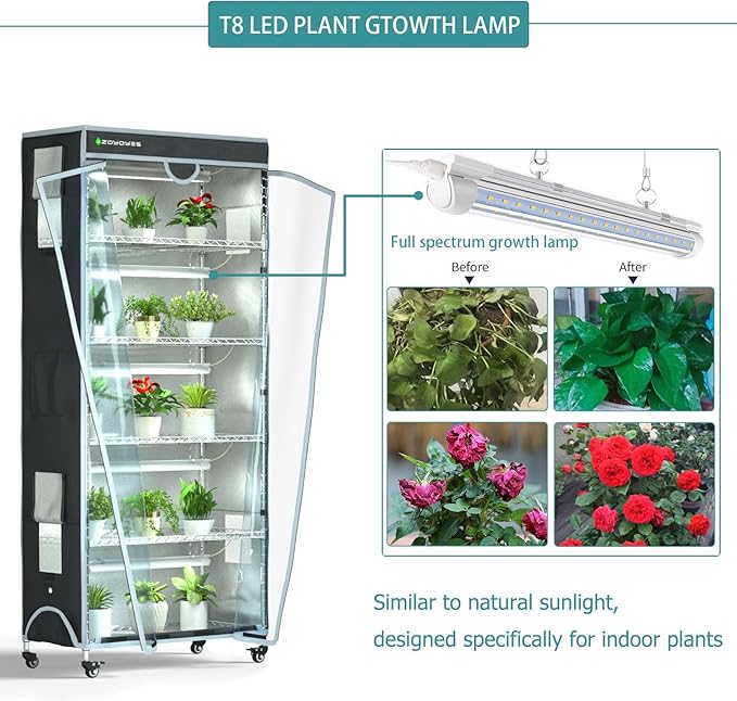- 5. This small greenhouse is equipped with 5 T8 full spectrum grow lights and reflectors to enhance plant growth, boost photosynthesis, and protect your eyes. The full spectrum lighting is ideal for the seedling, vegetative, and flowering stages of plants. It also features a 24-hour mechanical timer for precise light control and a temperature and humidity meter to ensure optimal conditions. Perfect for indoor plant care, encouraging healthy plant growth year-round